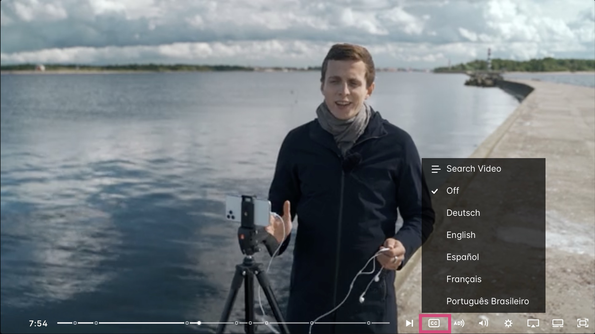 No vídeo, clique no botão CC no canto inferior direito da janela do vídeo e selecione seu idioma preferido. Você pode escolher "Desligado" para desativar as legendas.