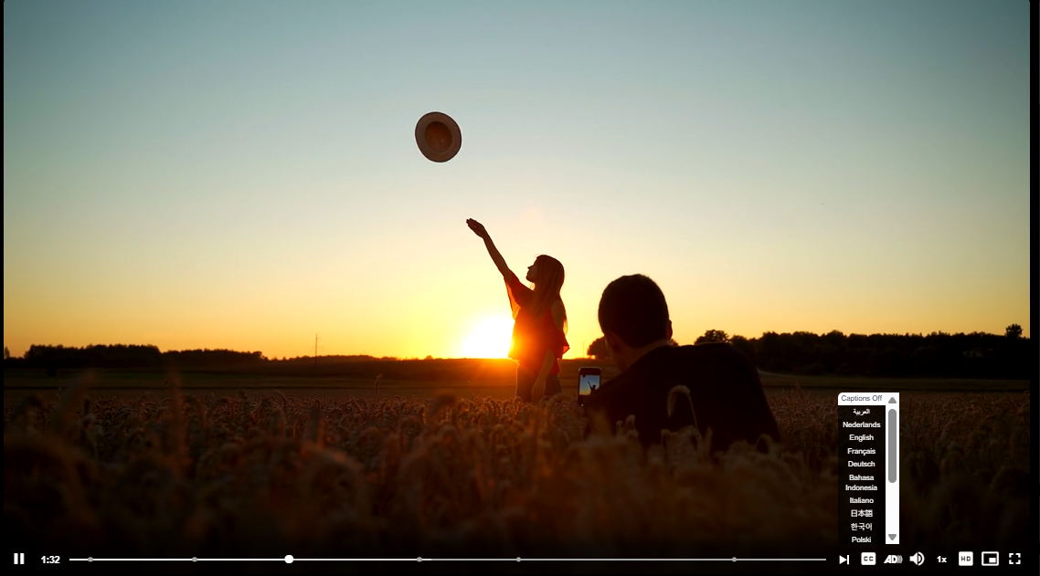Klik in het videovenster op de knop CC rechtsonder en kies de taal die je wilt gebruiken. Je kunt ook Off selecteren om de ondertiteling uit te schakelen.