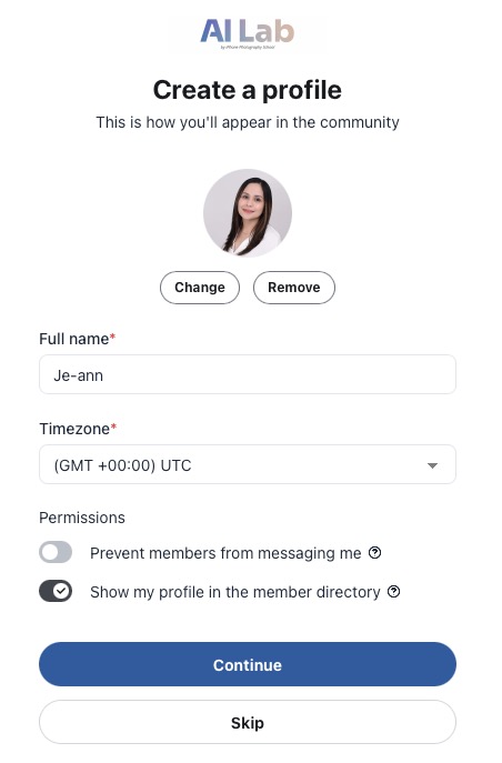- Upload your profile photo and adjust permissions. Click Continue.